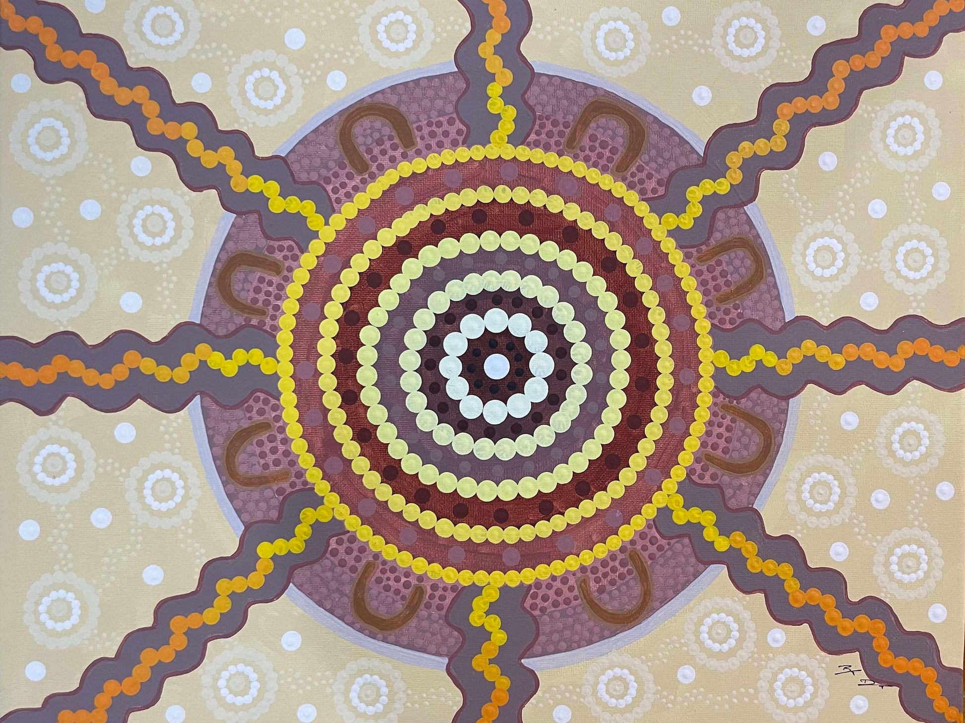 In this artwork I wanted God to be the focus and pay tribute to his greatness. I have added the symbol for people gathering in the brown outer circle to show God’s creation coming to him and soaking in his splendour and holiness.